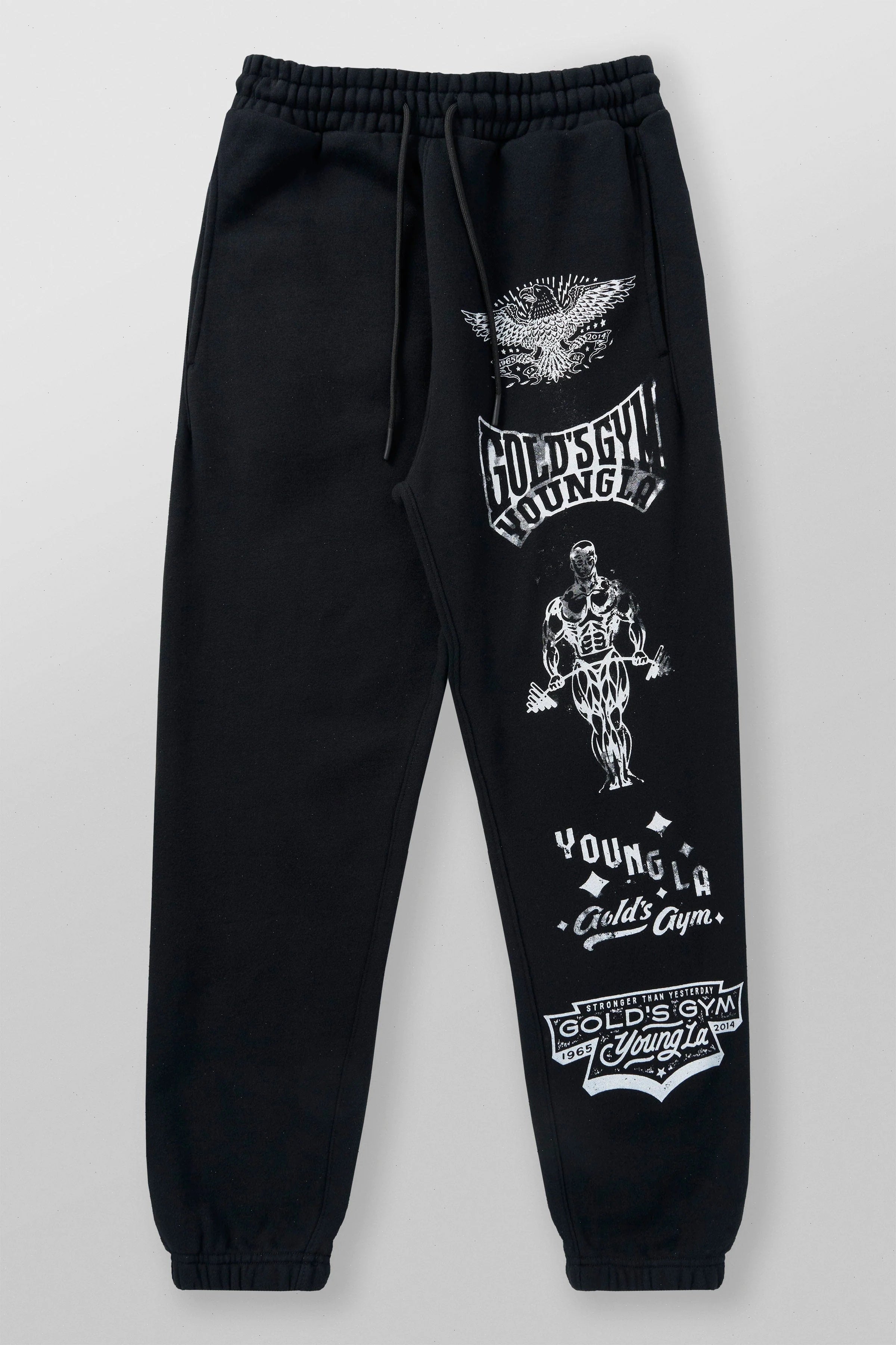 DESIGN: Introducing the Gold’s Gym x YoungLA cuffed joggers – inspired by YoungLA’s best-selling Immortal Joggers. These joggers feature bold printed logos along one leg, blending classic gym heritage with modern streetwear style. Perfect for comfort and style, they bring the iconic look of Gold’s Gym to a versatile everyday piece.
