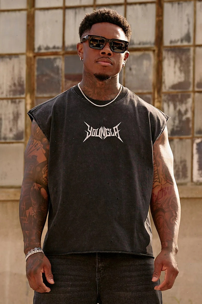 DESIGN: Designed for the grind, this cut-off tank features a distressed wash, raw sleeves, and a striking front logo hit. The boxy fit and heavy cotton bring a vintage vibe with a strong presence—perfect for training or flexing off-duty.