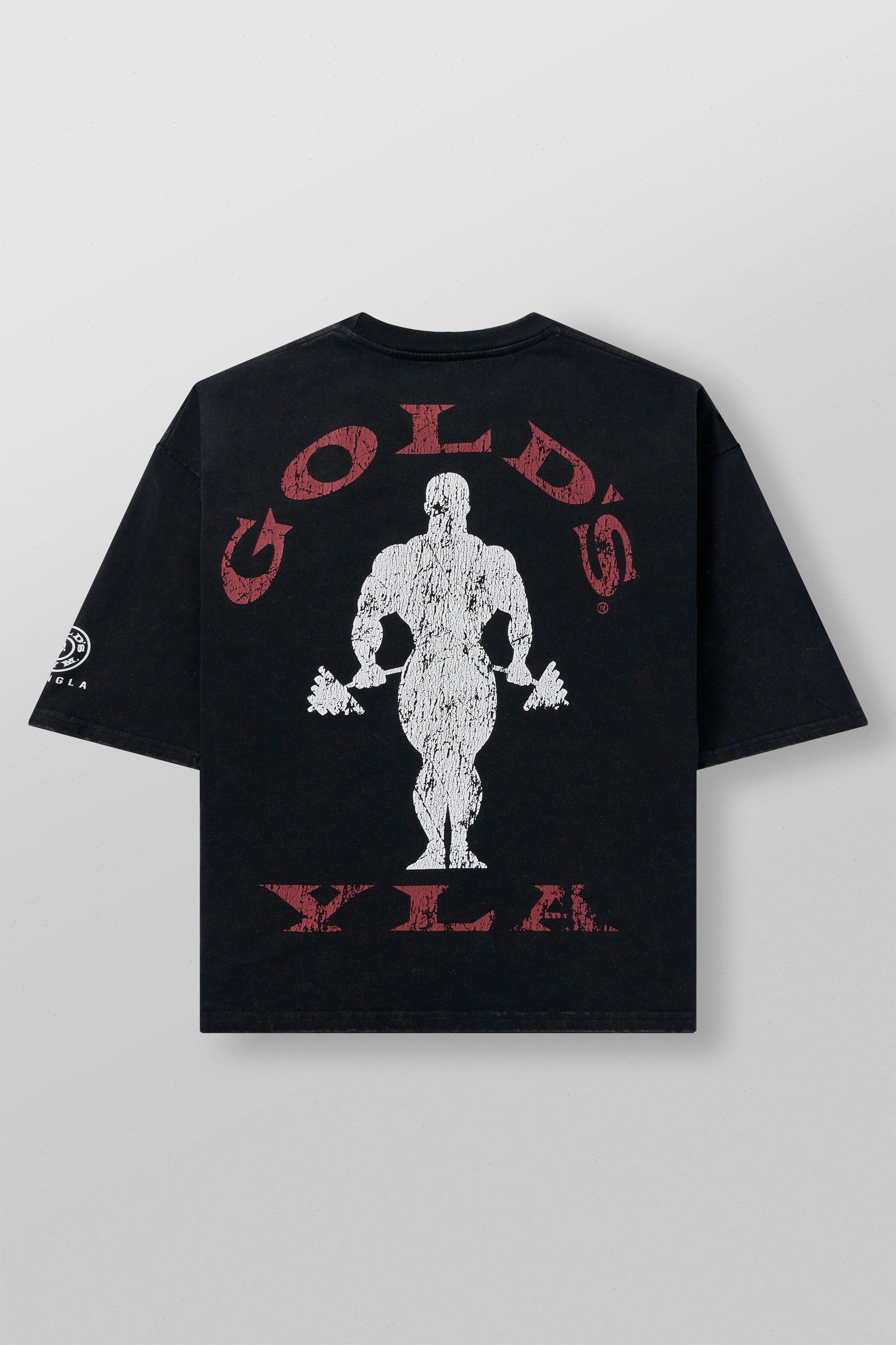 DESIGN: This YoungLA x Gold's Gym collaboration tee combines vintage-inspired graphics with a trendy, oversized boxy fit. Designed with a shorter length for a modern edge, it features a distressed Gold's Gym x YoungLA print on the back, giving it a classic, worn-in look that's perfect for casual wear or hitting the gym.