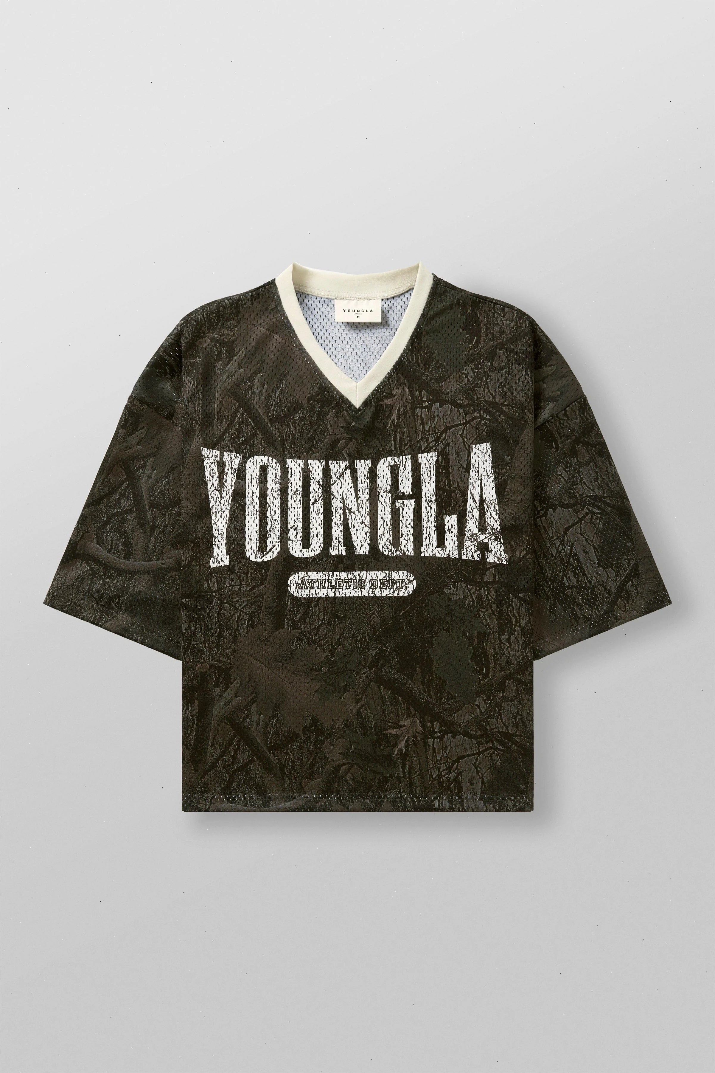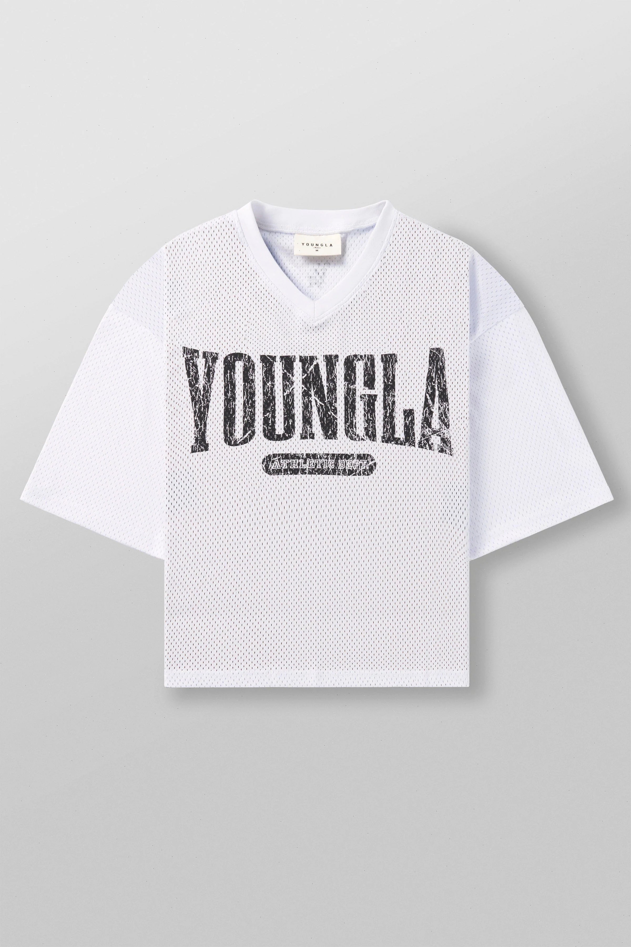 DESIGN: Introducing the Varsity Jersey, a cropped football jersey crafted from 100% polyester mesh. Featuring a ribbed V-neck and a distressed YoungLA logo printed on the chest, this jersey offers .