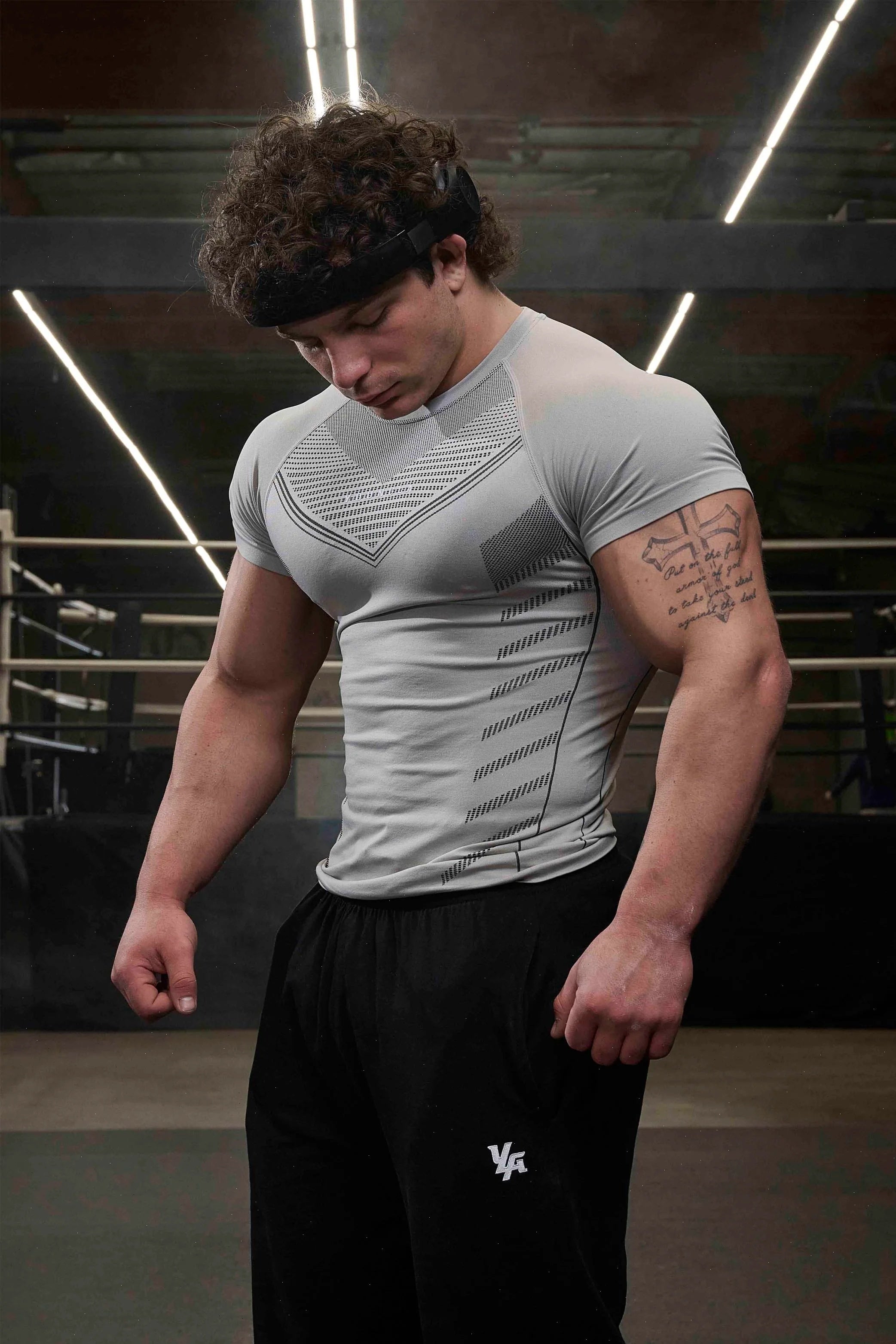 DESIGN: Bring your inner superhero out with these compression tees. Made with stretchy and fitted compression fabric. The jacquard style has the pattern incorporated into the weave of the fabric. The structure of the tee is designed to stand and help support heavy lift movements.