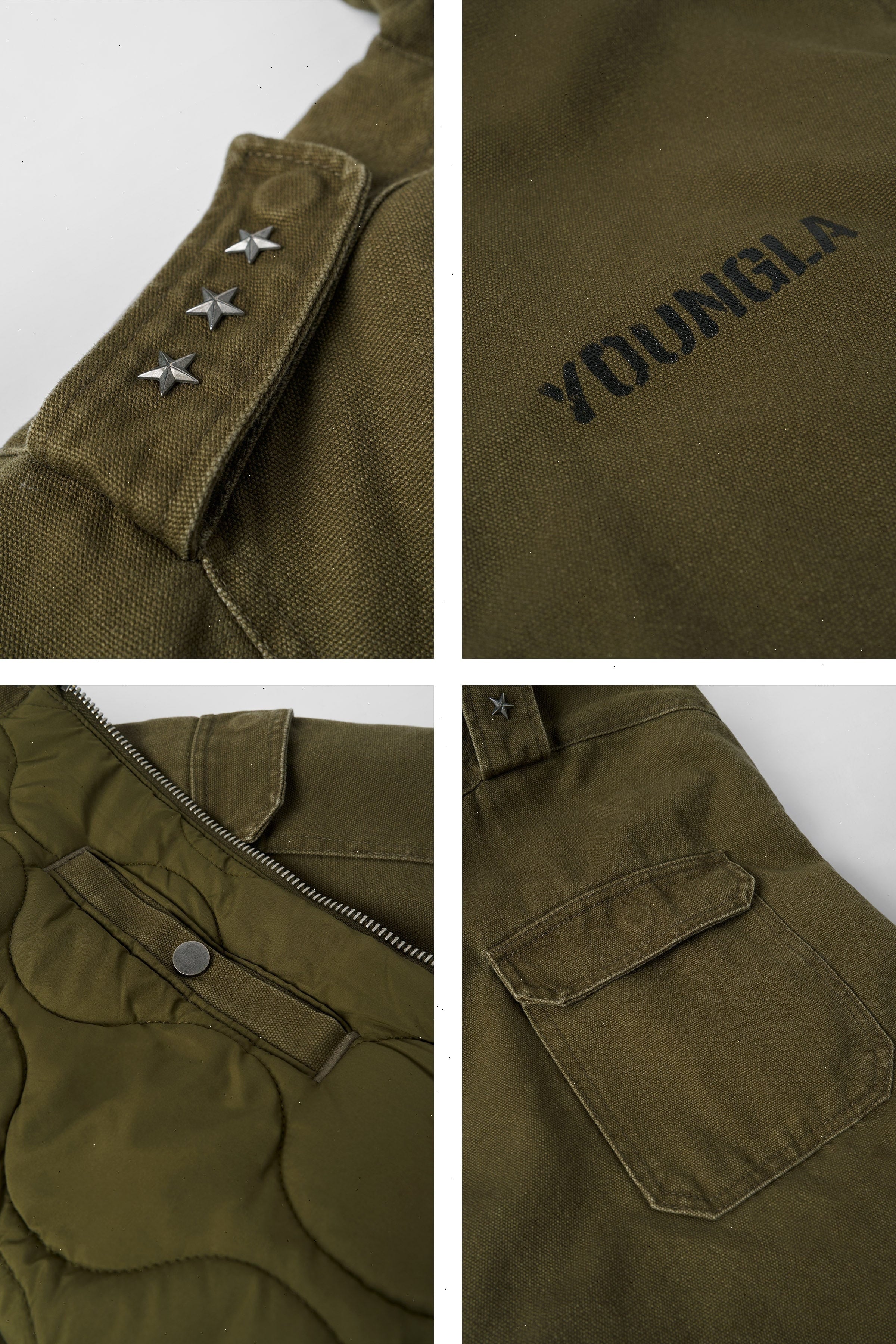 DESIGN: Meet the Aviator Jacket – built for durability with a rugged heavy-duty cotton shell. The interior boasts a soft lining with a unique stitch pattern, providing comfort with a touch of sophistication. With seam cuts, panel detailing, and 3-star studs on the shoulders, this jacket embodies a military combat aesthetic.