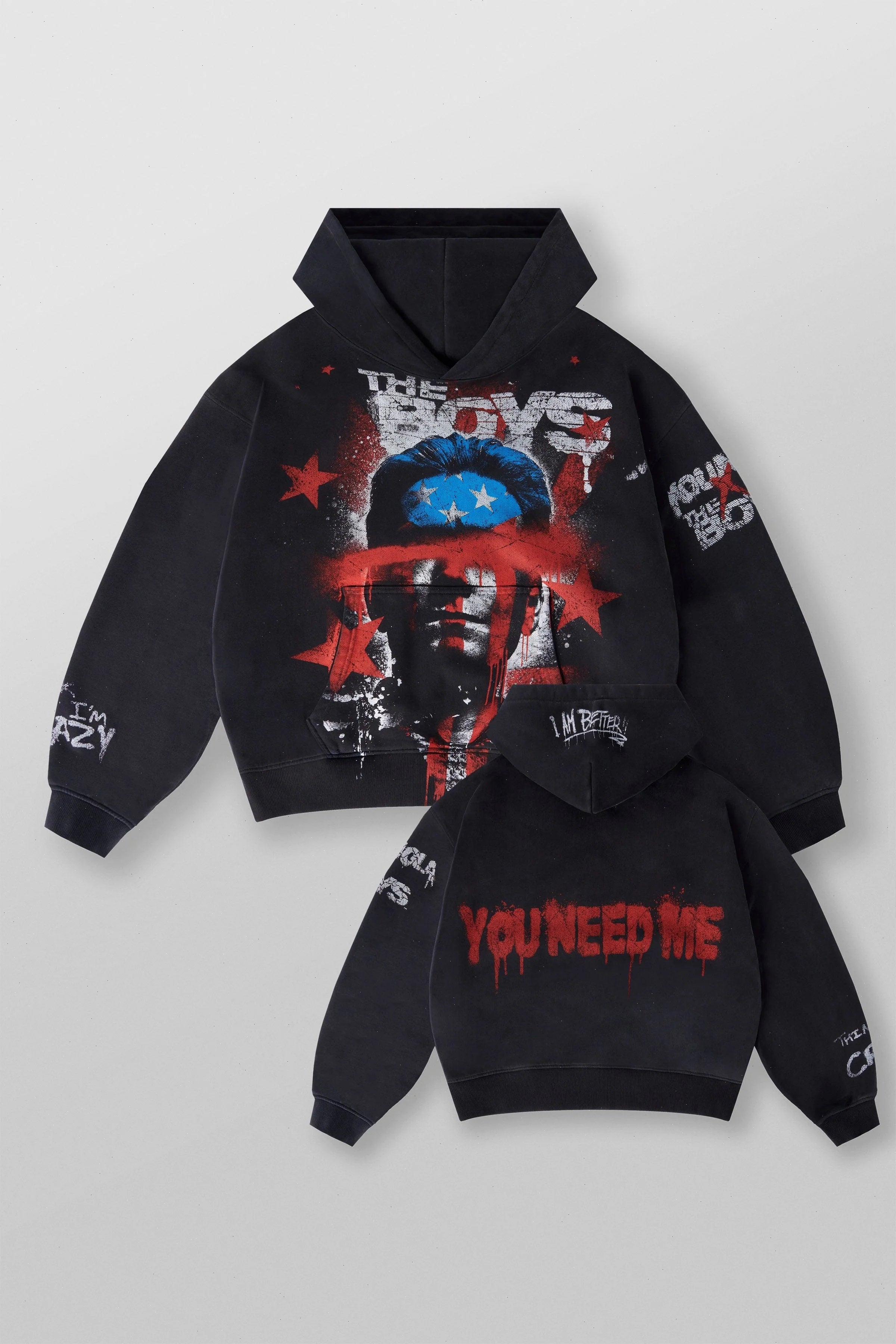 DESIGN: Not your average hoodie. This heavyweight 460 GSM pullover is built from 100% cotton and features a raw, distressed graphic from The Boys. Bold stars, slashed red paint strokes, and a rebellious aesthetic. Oversized, unapologetic, and ready for the streets.