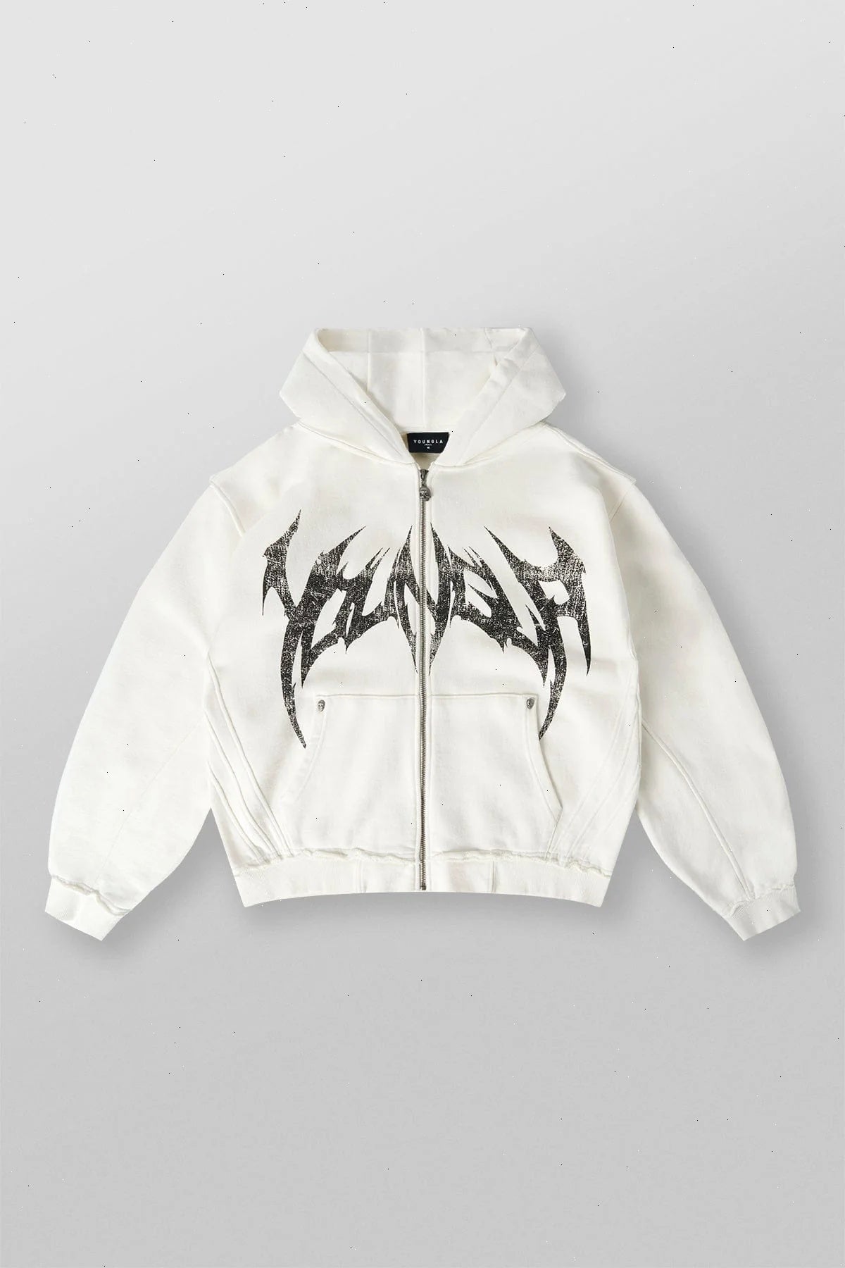 DESIGN: The Villain Hoodie is a statement piece with an edge. This zip-up hoodie features a distressed logo across the chest, skull-studded pocket corners and zipper puller, and exposed raw seams on the waistband and cuffs for a rebellious, worn-in look.