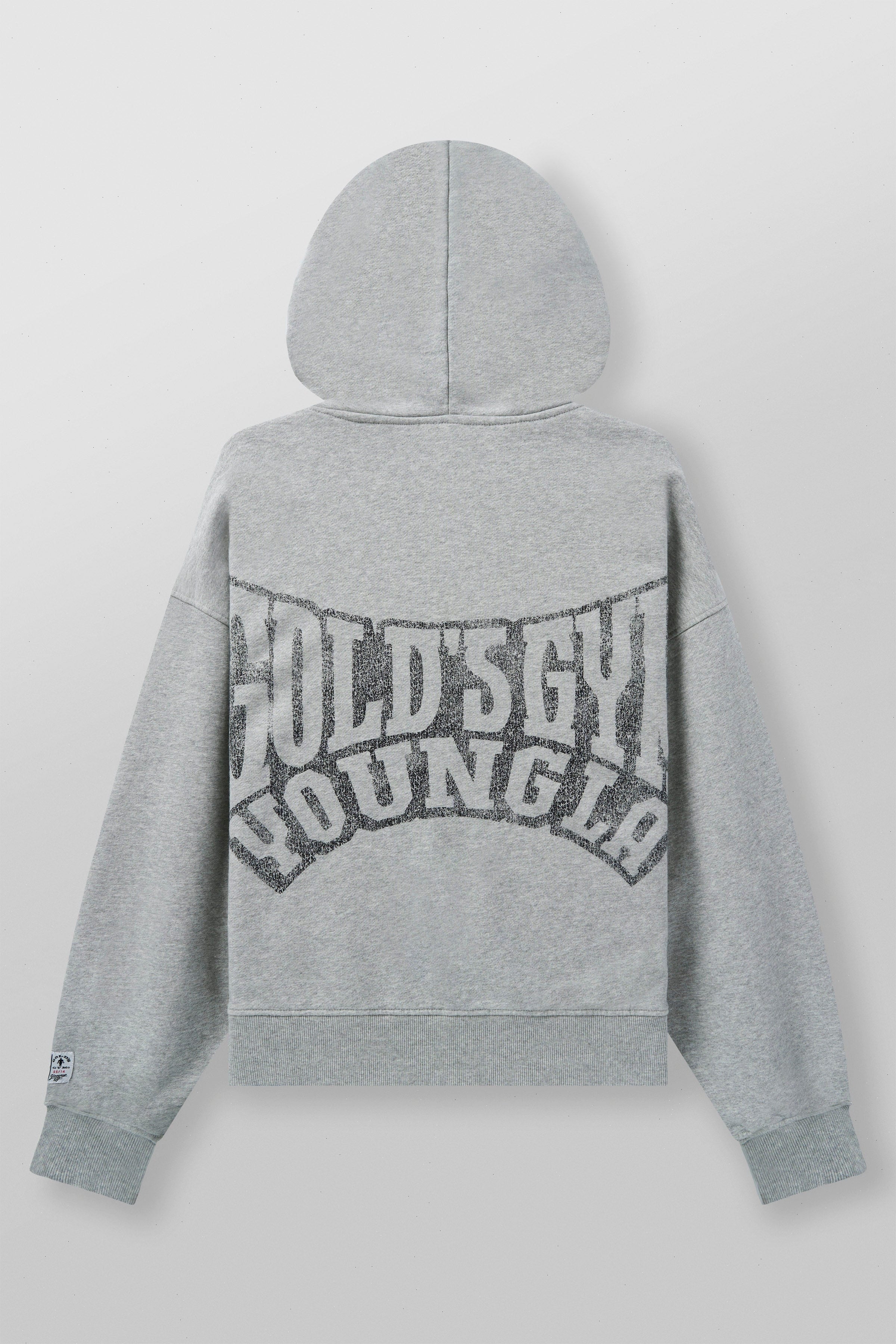 DESIGN: This zip-up hoodie from the Gold’s Gym x YoungLA collaboration combines classic gym style with modern streetwear. Featuring an oversized fit and a washed fabric for a vintage vibe, it’s designed for maximum comfort and a laid-back look. The back showcases a bold, distressed Gold's Gym x YLA graphic, adding a statement piece to your wardrobe.