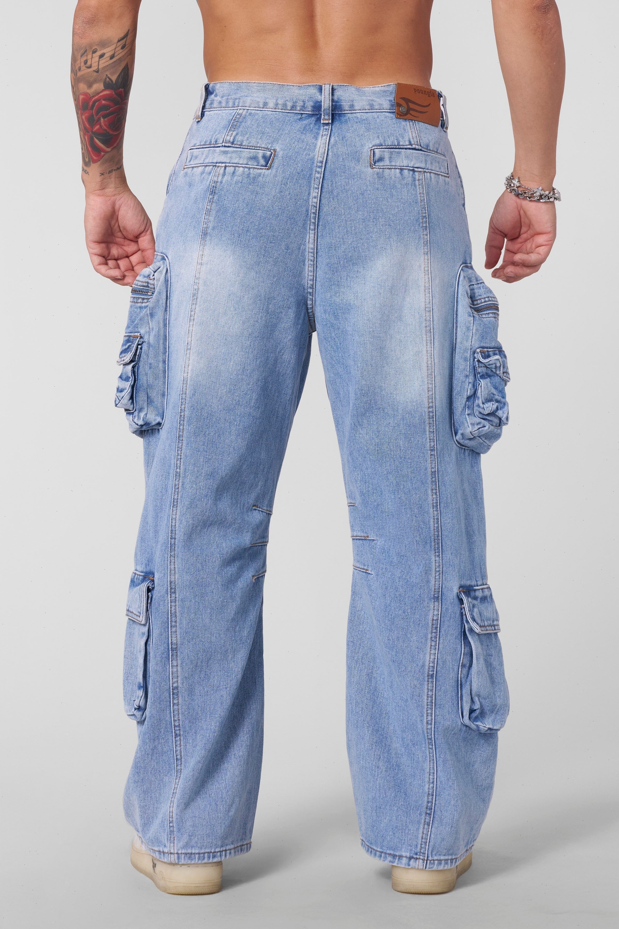 DESIGN: Built for style and function, these stacked jeans feature a relaxed wide-leg fit with heavy pocket detailing throughout. Designed in a vintage-inspired denim wash, they include multiple flap and zippered cargo pockets for an edgy, utilitarian look.