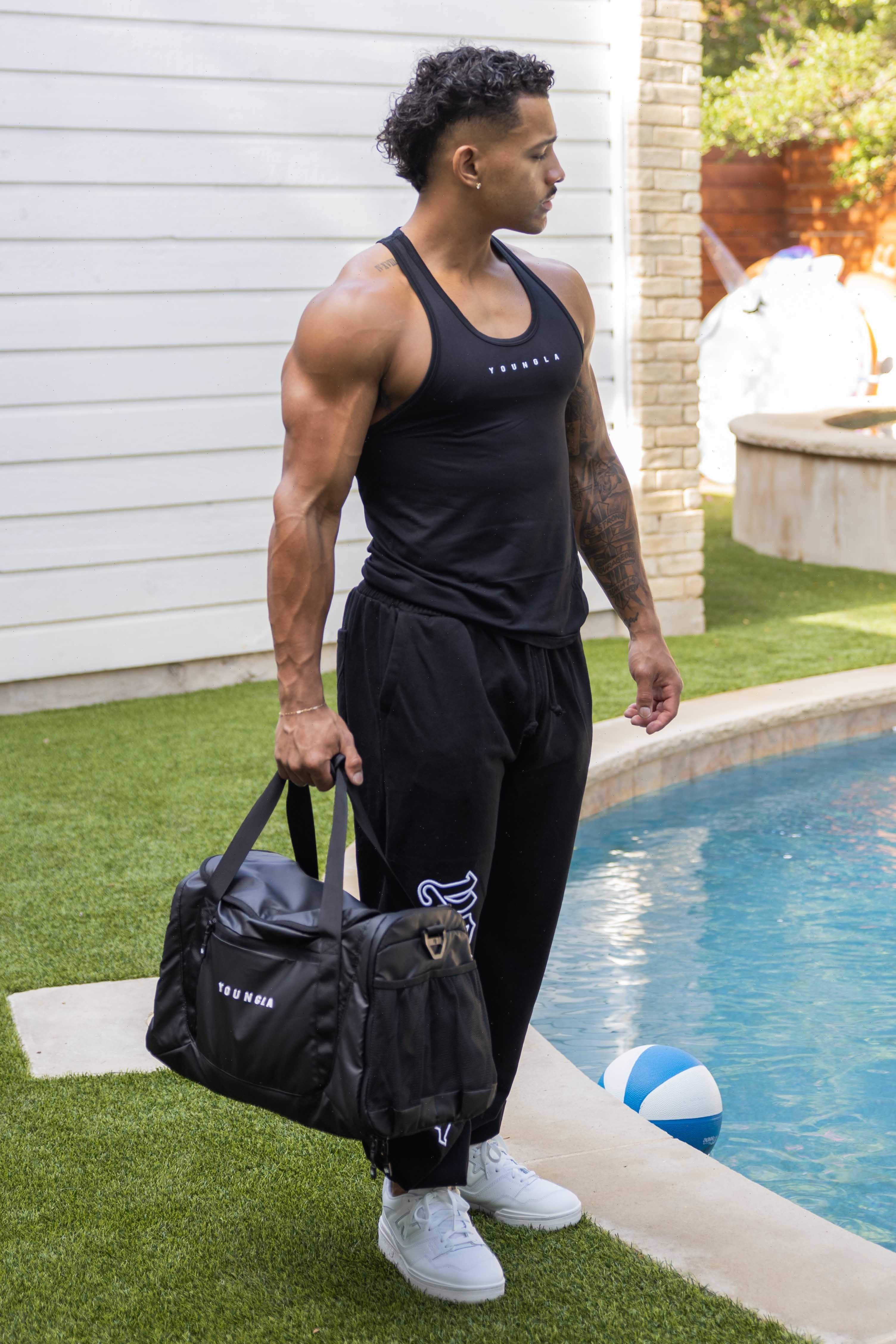 Gym duffle bag with spacious main compartment and flap pocket for extra storage