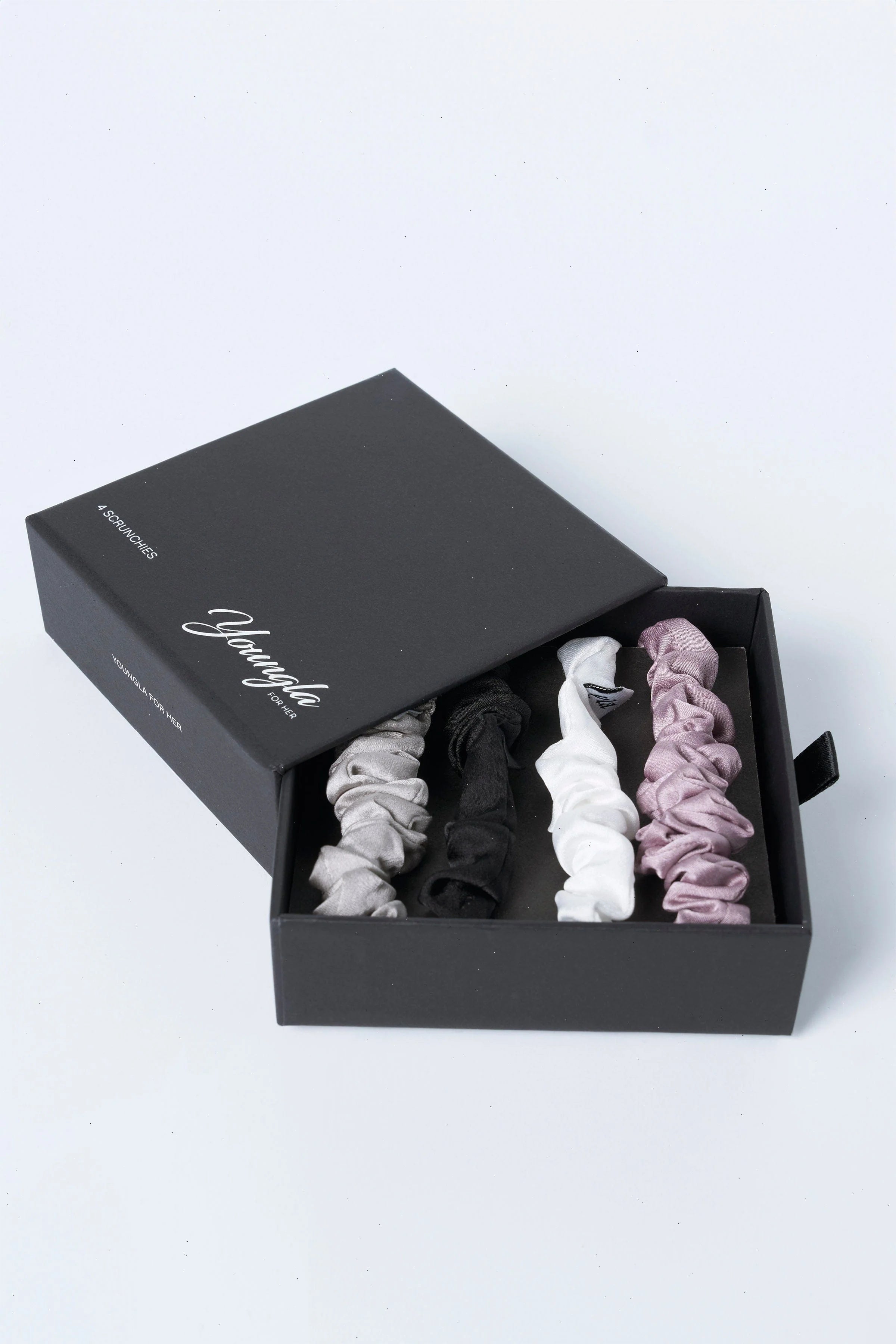 DESIGN: Luxurious satin scrunchies that are soft, stretchy, and designed to prevent tangles and hair breakage. Perfect for wearing on your wrist or tying up your hair, these scrunchies come in elegant packaging, adding a touch of sophistication to your everyday style. Comes in a pack of 4 neutral colors.