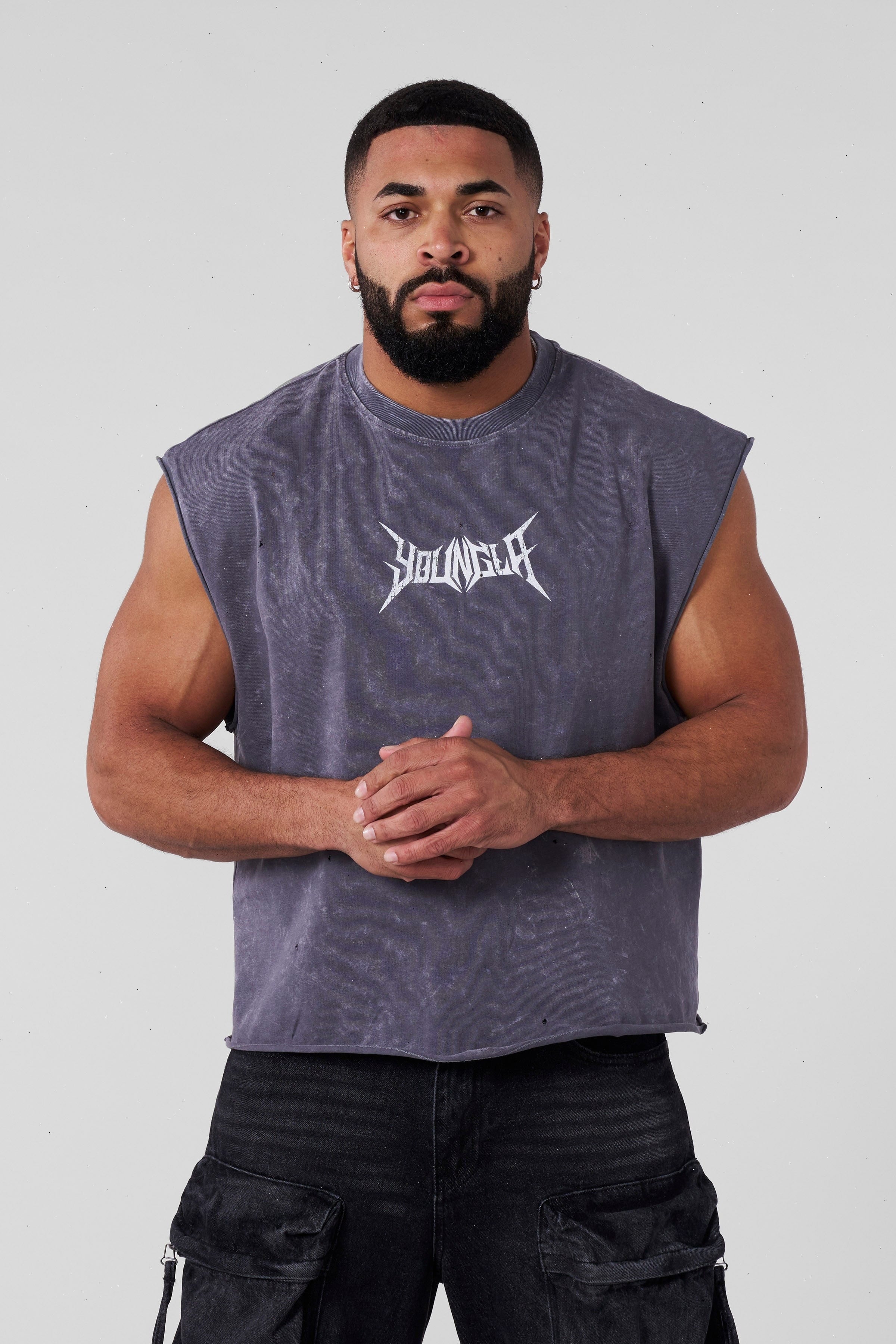 DESIGN: Designed for the grind, this cut-off tank features a distressed wash, raw sleeves, and a striking front logo hit. The boxy fit and heavy cotton bring a vintage vibe with a strong presence—perfect for training or flexing off-duty.