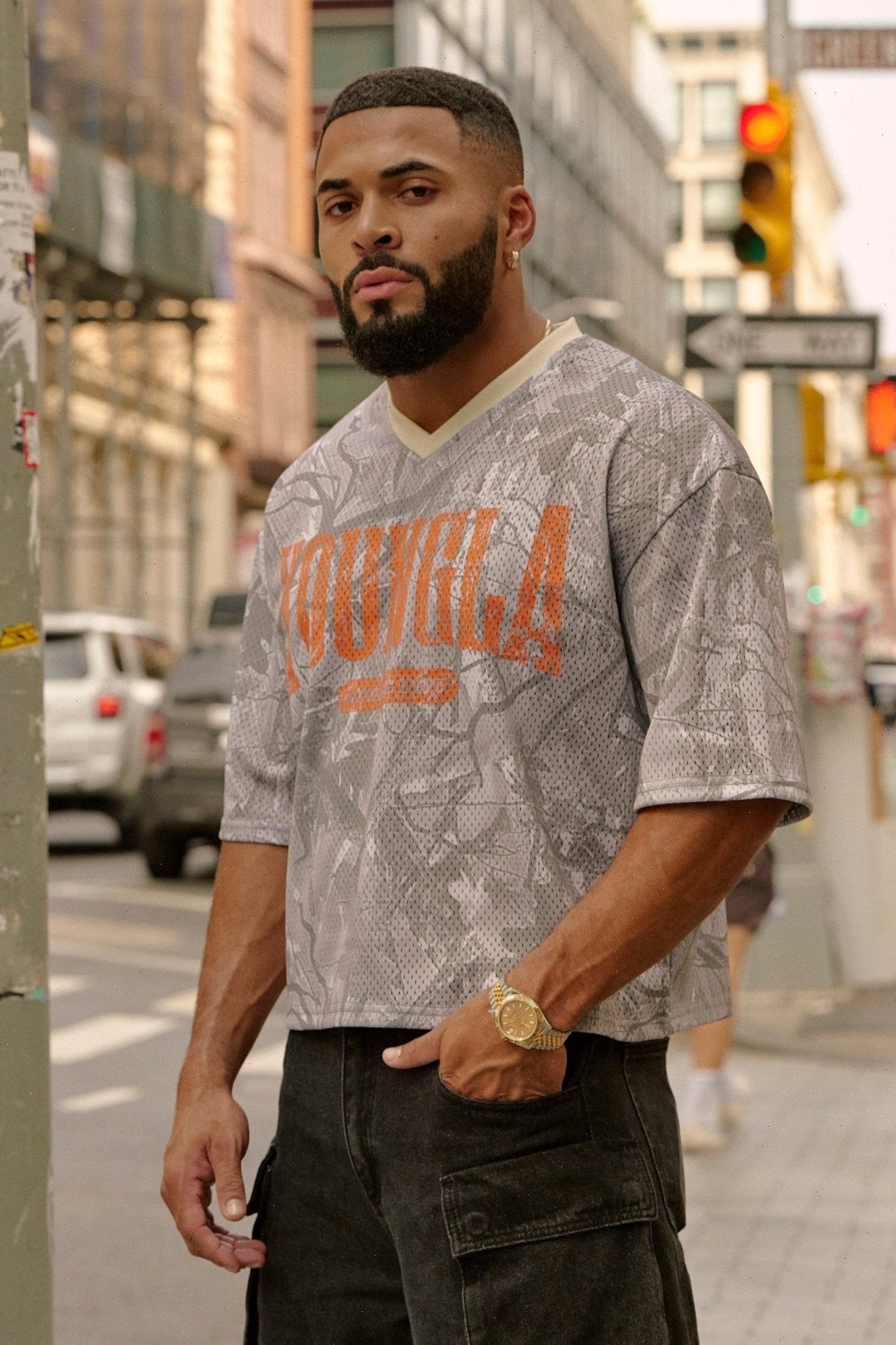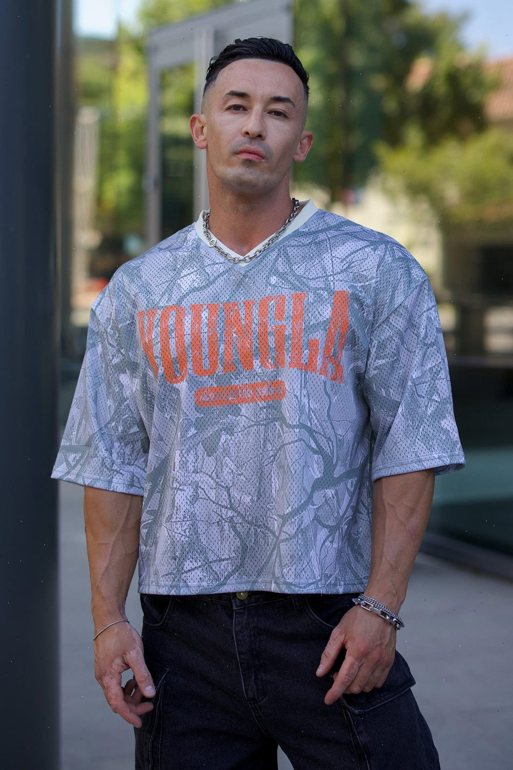 DESIGN: Introducing the Varsity Jersey, a cropped football jersey crafted from 100% polyester mesh. Featuring a ribbed V-neck and a distressed YoungLA logo printed on the chest, this jersey offers .