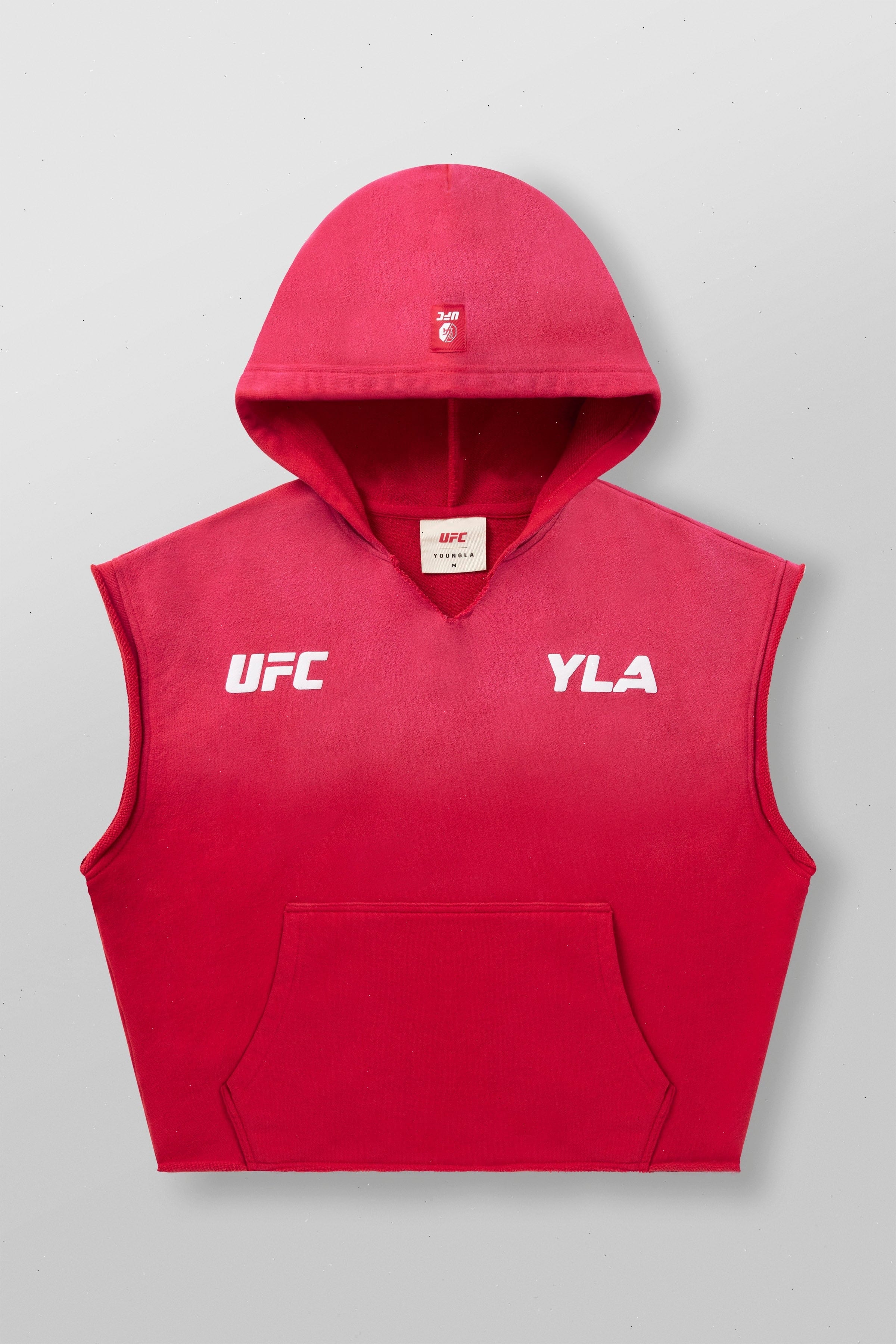 DESIGN: Introducing the YoungLA x UFC cut-off hoodie, made from 100% cotton for a soft and relaxed fit. This sleeveless hoodie features puff print logos on the chest and is garment-washed for a cool vintage look. Whether you're working out or relaxing, this hoodie combines style and comfort, perfect for any UFC fan looking for an effortless athletic vibe.