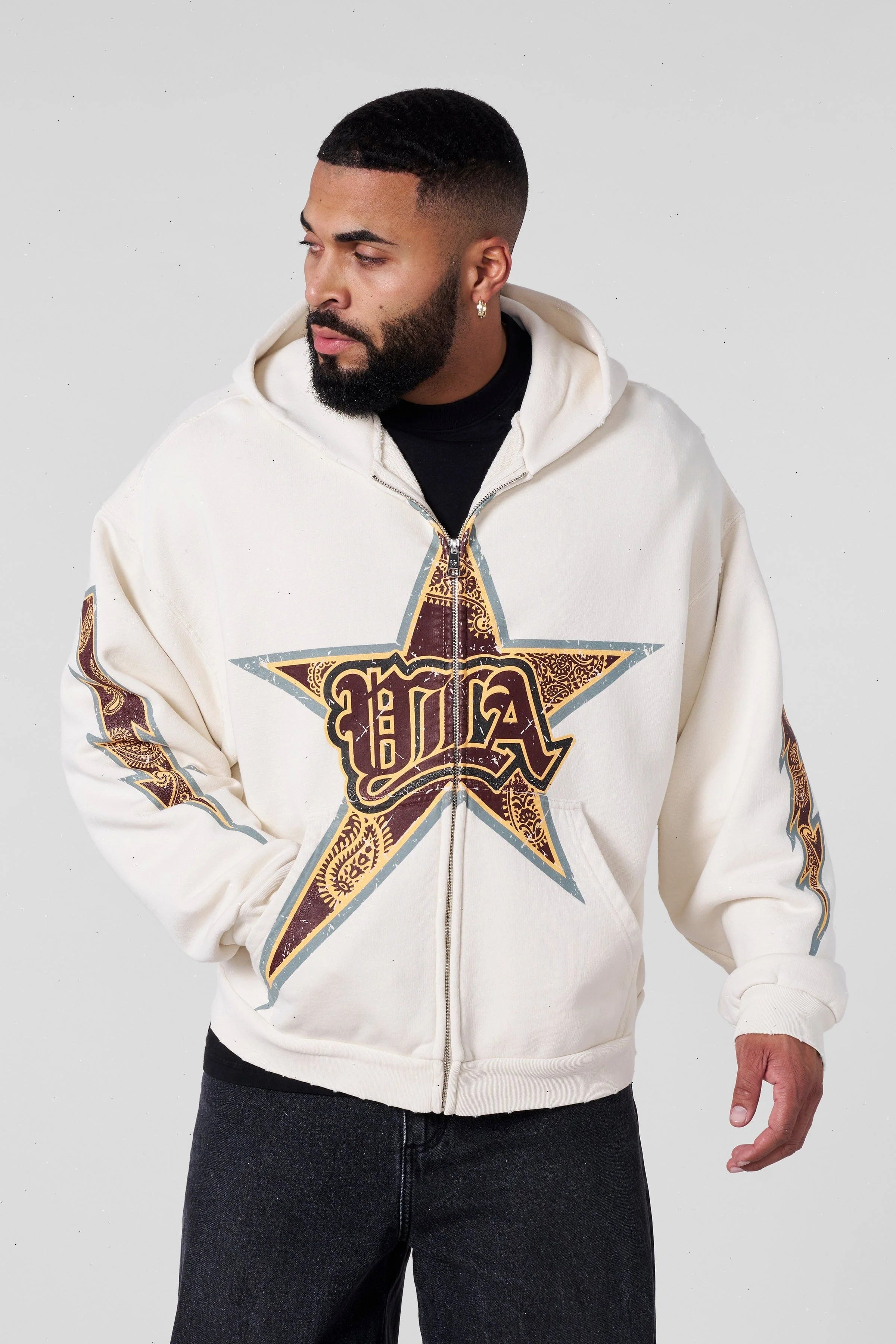 DESIGN: Elevate your streetwear collection with the Super Star Hoodie, crafted from premium cotton with a heavyweight 540 GSM fabric for unmatched quality and comfort. This zip-up hoodie features a bold star graphic on the chest and striking thunderbolt prints on the sleeves, making it a standout piece.