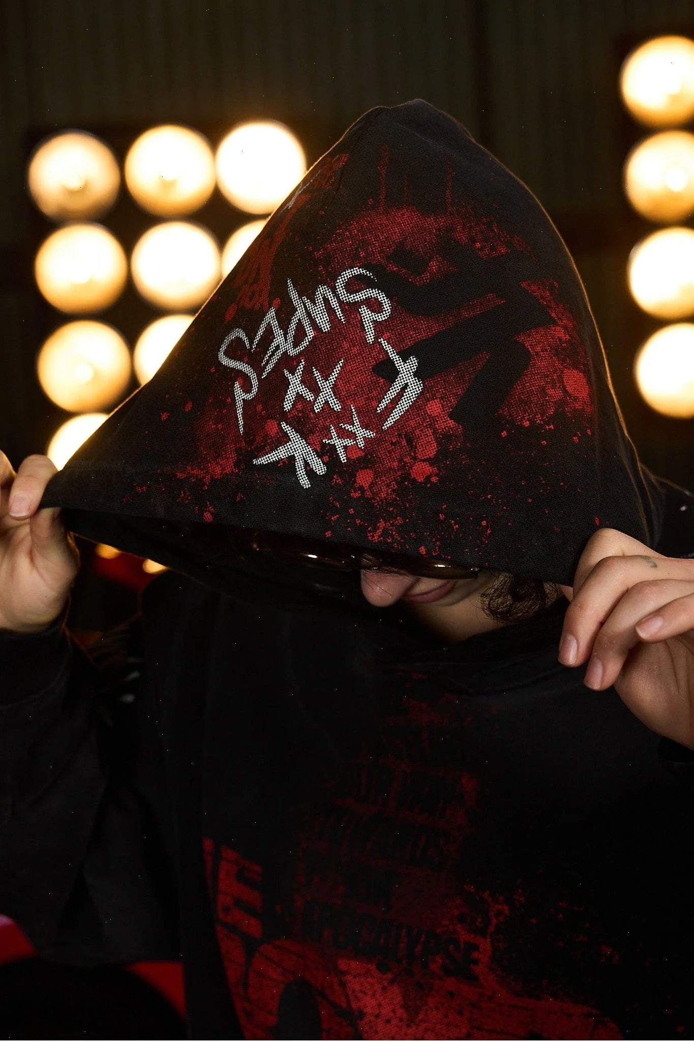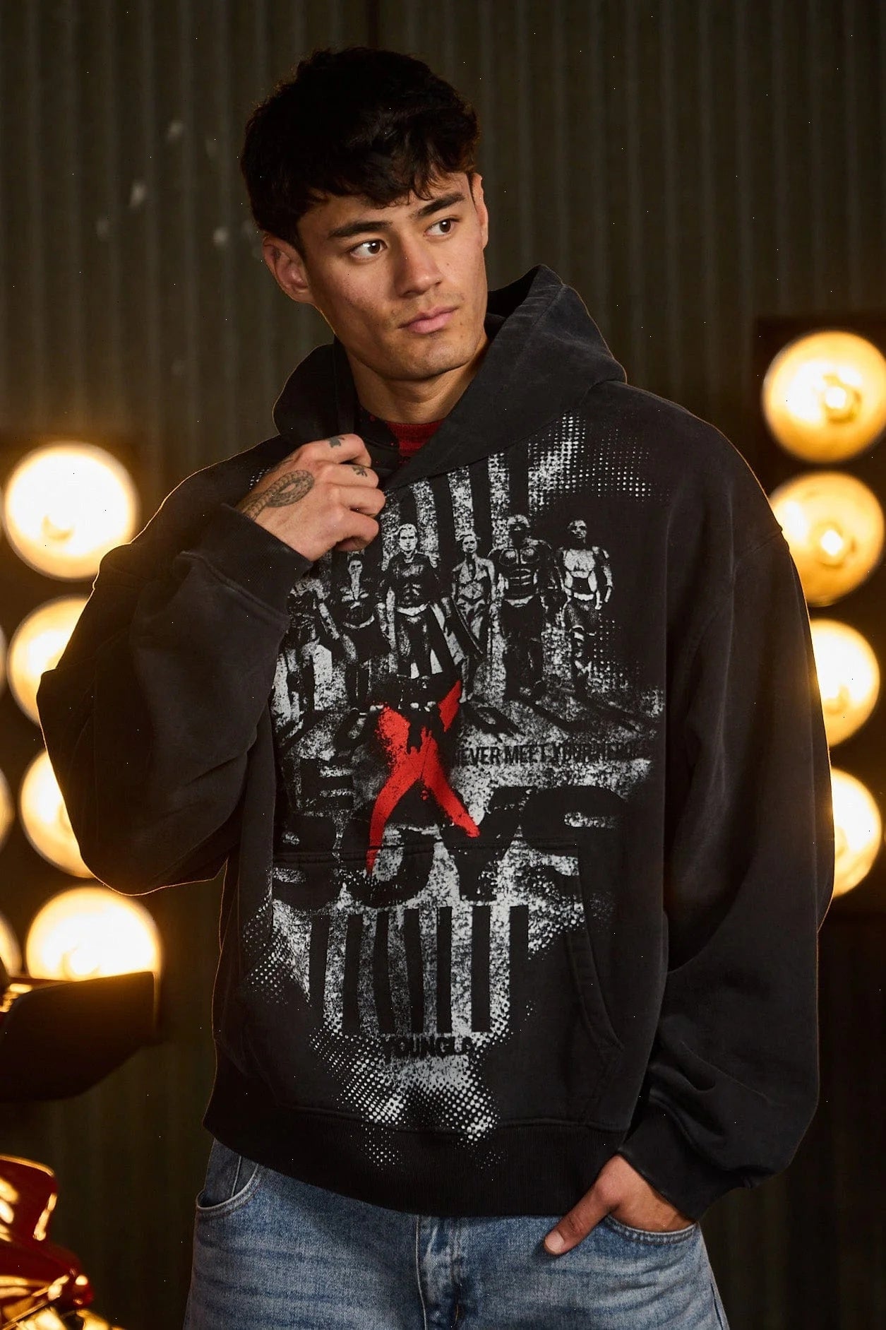 DESIGN: Not your average hoodie. This heavyweight 460 GSM pullover is built from 100% cotton and features a raw, distressed graphic from The Boys. Bold stars, slashed red paint strokes, and a rebellious aesthetic. Oversized, unapologetic, and ready for the streets.