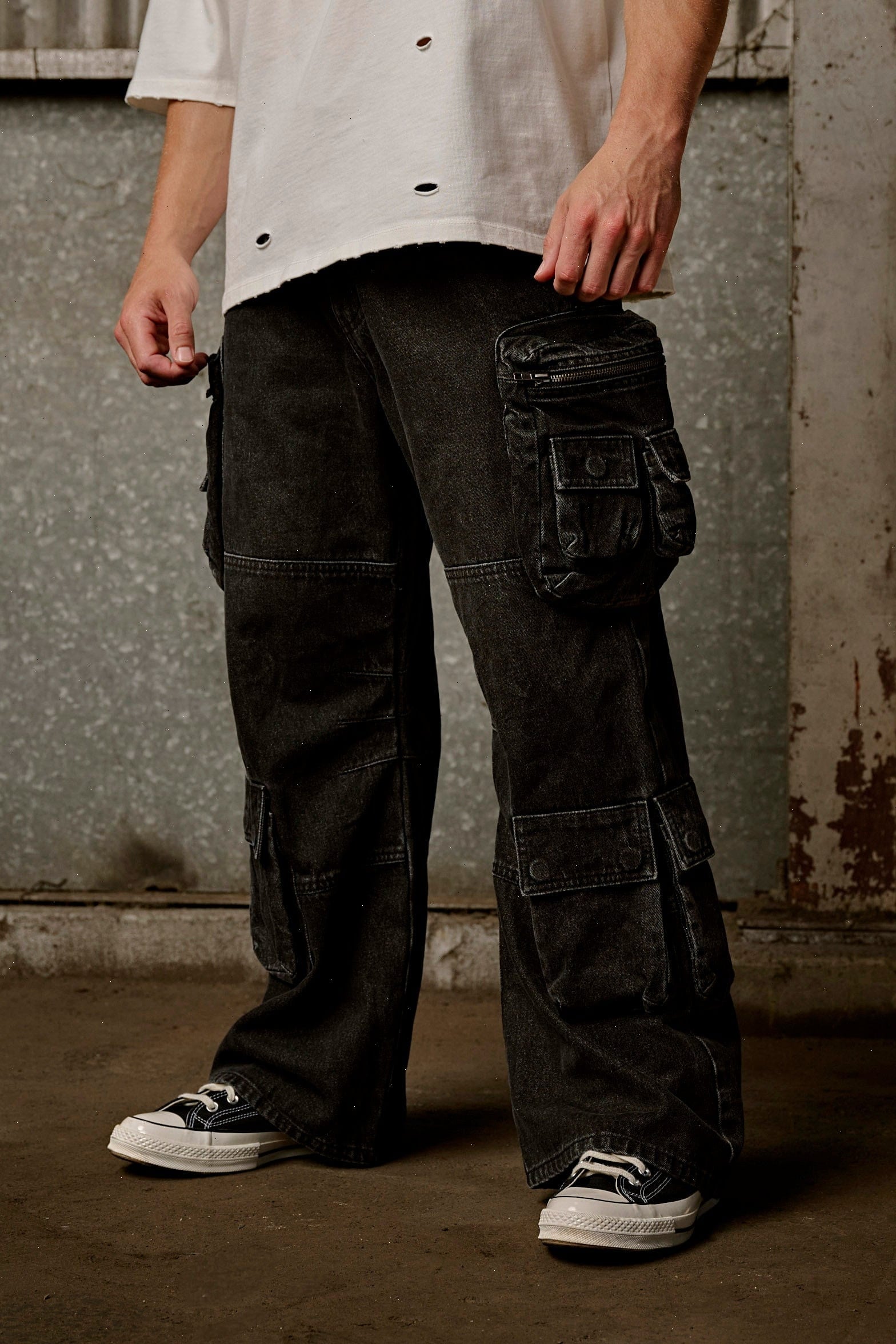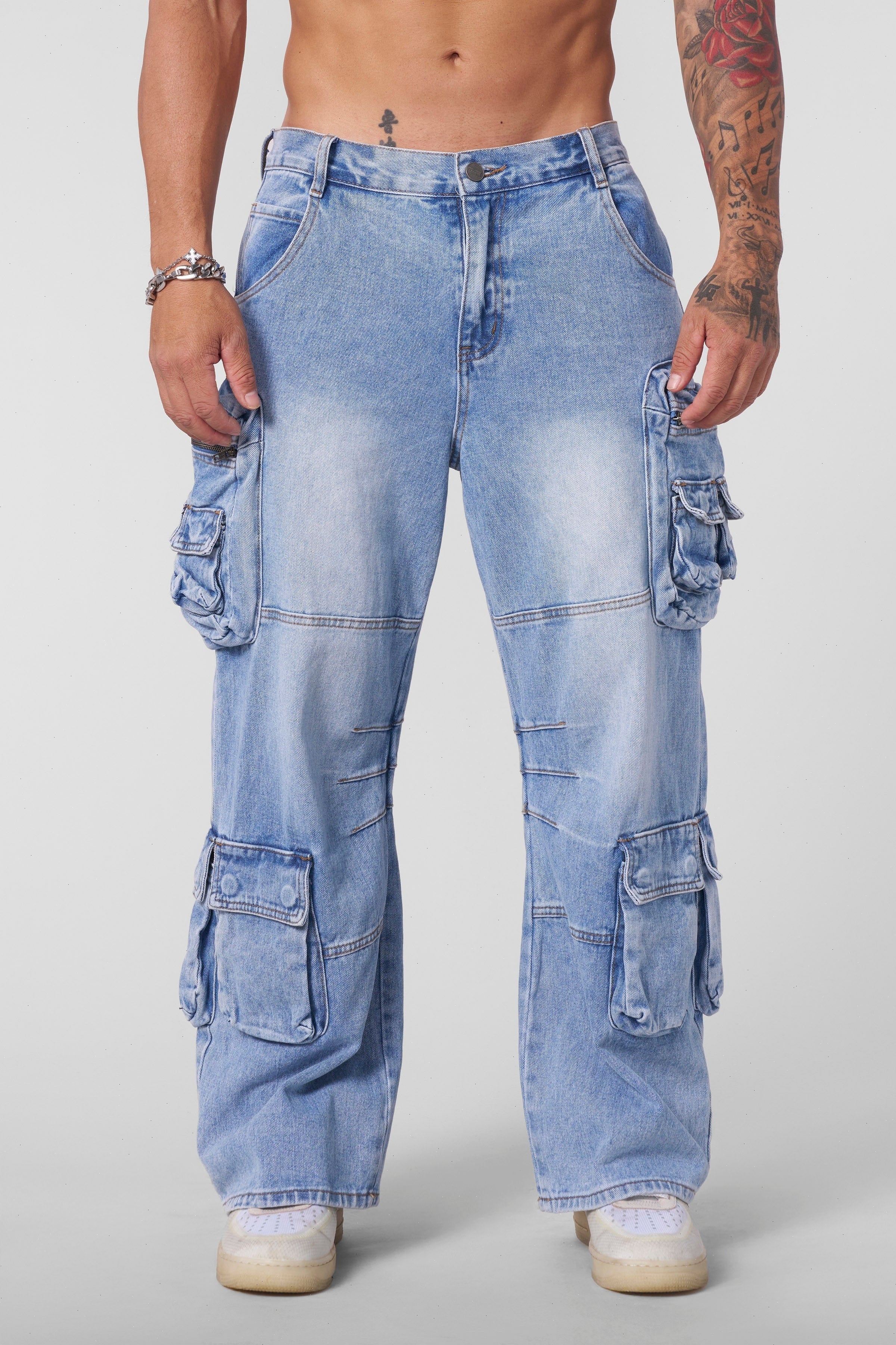 DESIGN: Built for style and function, these stacked jeans feature a relaxed wide-leg fit with heavy pocket detailing throughout. Designed in a vintage-inspired denim wash, they include multiple flap and zippered cargo pockets for an edgy, utilitarian look.